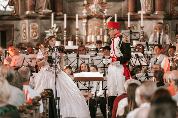 Wenn auch das Konzert witterungsbedingt vom Kirchplatz in die Pfarrkirche St. Andreas verlegt wurde und es hier und da immer noch Tropfen vom Himmel ließ, kam jeder auf seine Kosten. Dafür sorgte nach zünftigem Einmarsch die „MiniBand“ mit Dirigentin Clara Murphy: Die „Buben und Madln“ präsentierten mit der schwungvollen Musicalmelodie „Beauty And The Beast“, dem locker-leichten Werk „Summer Nights“ aus dem Musical „Grease“ und der hymnischen Melodie „Down By The Salley Garden“ sehr ansprechendes Werke und den Beweis, dass die Jugendarbeit des MVS ihren Zweck bestens erfüllt. So erfreuten sich die zahlreichen Besucher – die Kirche war voll besetzt inklusive Treppe und Empore – an schönen Melodien und der fröhlichen Moderation: Maren Greß als Kaiserin Sissi im adretten Kleid und Valentin Gehrig als Kaiser Franz duellierten sich aufs Vergnüglichste; Romy Eisenhauer als Zimmermädchen Henriette huldigte Klatsch und Tratsch, während Jonas Henn in der hinreißend komischen Rolle des Oberst Böckel ganz aufging.